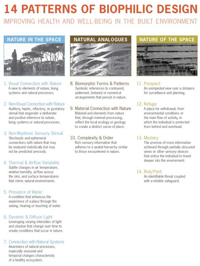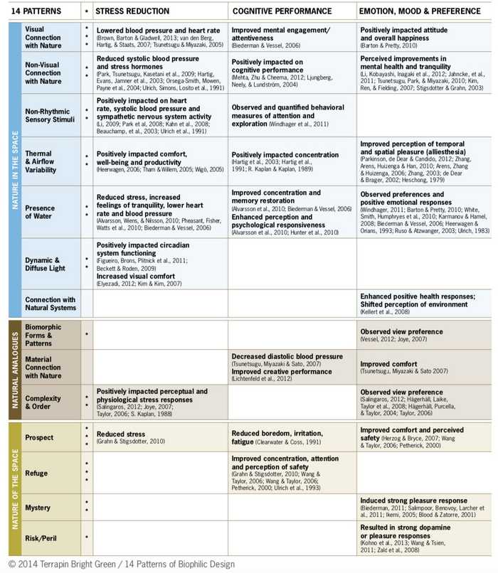 Terrapin Bright Green was founded in 2006 by distinguished environmental strategist Bill Browning and architects Rick Cook and Bob Fox of the prestigious firm COOKFOX Architects. Chris Garvin, an accomplished green architect, soon joined the firm. This architectural firm has identified 14 biophilic design patterns that can help us to implement this study on how we create the spaces surrounding us.