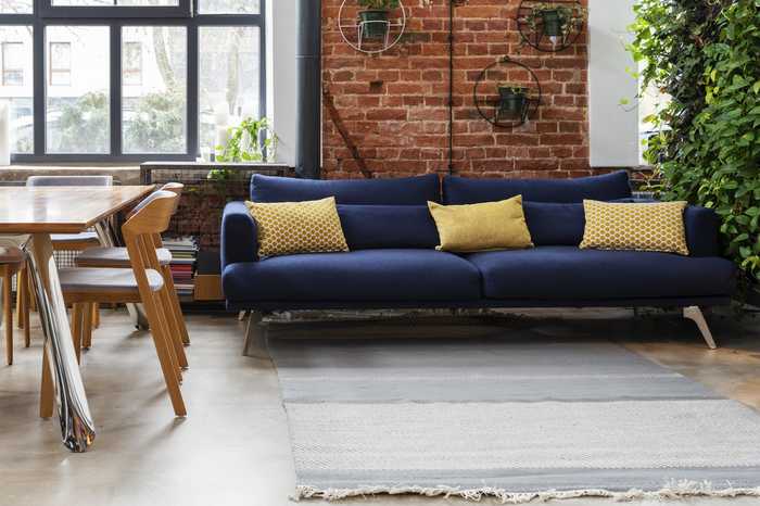 If you have your sights set on something a little more rustic, lived in, and uber-cosy, try combining navy with soft greys, and blush pinks. Wood-panelled or bare brick walls are great for achieving this look, as it adds texture to the room.
